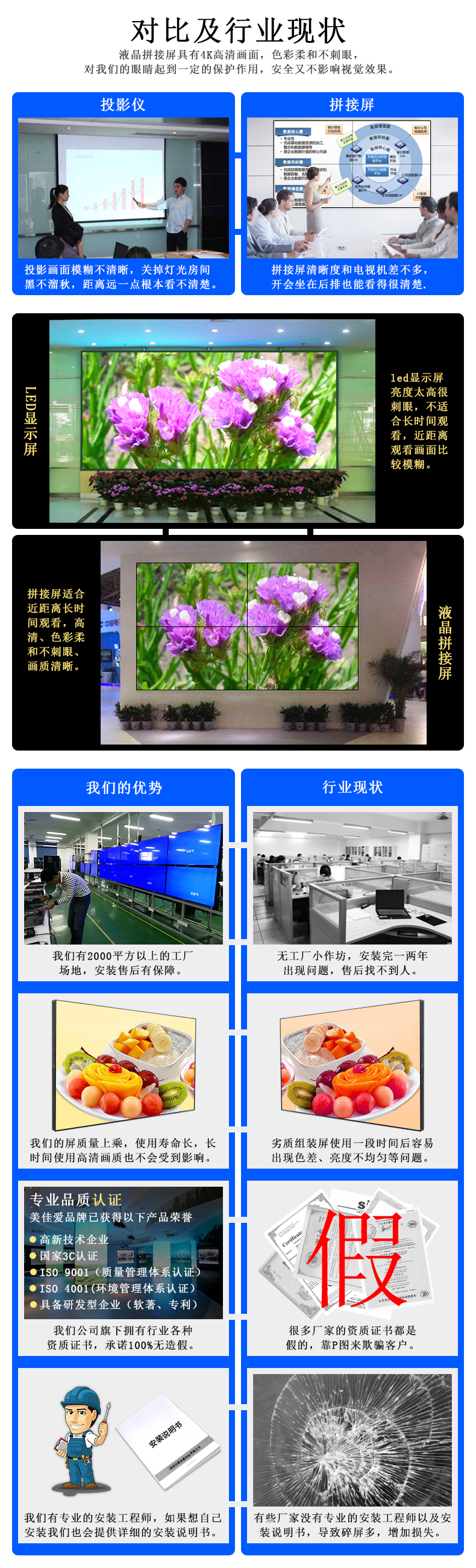 【美佳愛(ài)-4k液晶拼接屏生產(chǎn)廠家電話400-997-9971】LG55寸液晶拼接屏-拼縫8mm產(chǎn)品通過(guò)ISO9001_3C_節(jié)能認(rèn)證等30多項(xiàng)認(rèn)證,主營(yíng)LG/京東方/三星大屏幕電視墻,其尺寸有32寸40寸43寸46寸49寸55寸65寸75寸液晶拼接單元,也有曲面,弧形,柔性,無(wú)縫LED顯示屏,顯示器,超窄邊高清監(jiān)視器,提供企業(yè)展廳展示,KTV,酒吧,會(huì)議室,視頻監(jiān)控系統(tǒng)解決方案設(shè)計(jì)-報(bào)價(jià)-安裝施工-售后超窄邊維修等服務(wù)