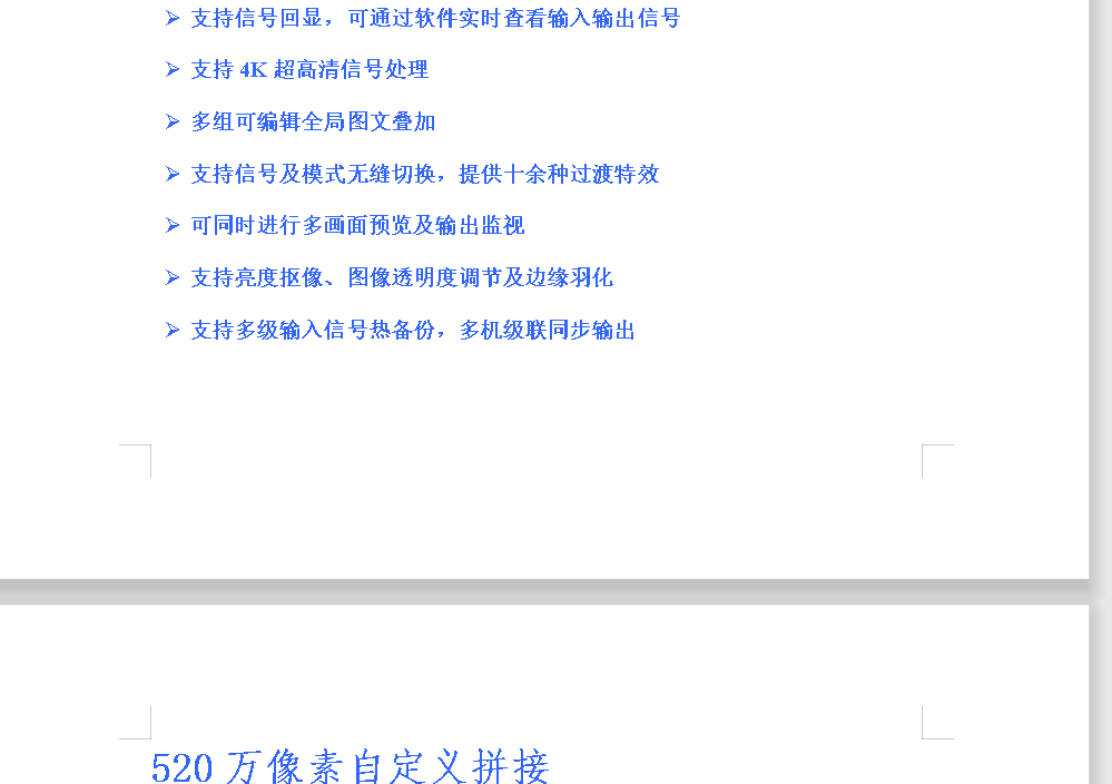 拼接輸出 | ·拼接輸出的分辨率最大可達(dá)520萬(wàn)像素,如:15360×330@60Hz(橫向拼接)或670×7680@60Hz(縱向拼接)或3072×1680@60Hz(田字型拼接),在這些范圍內(nèi)輸出大小可任意調(diào)節(jié) ·支持點(diǎn)對(duì)點(diǎn)拼接,多機(jī)可以級(jí)聯(lián)完成更大分辨率的拼接輸出 |