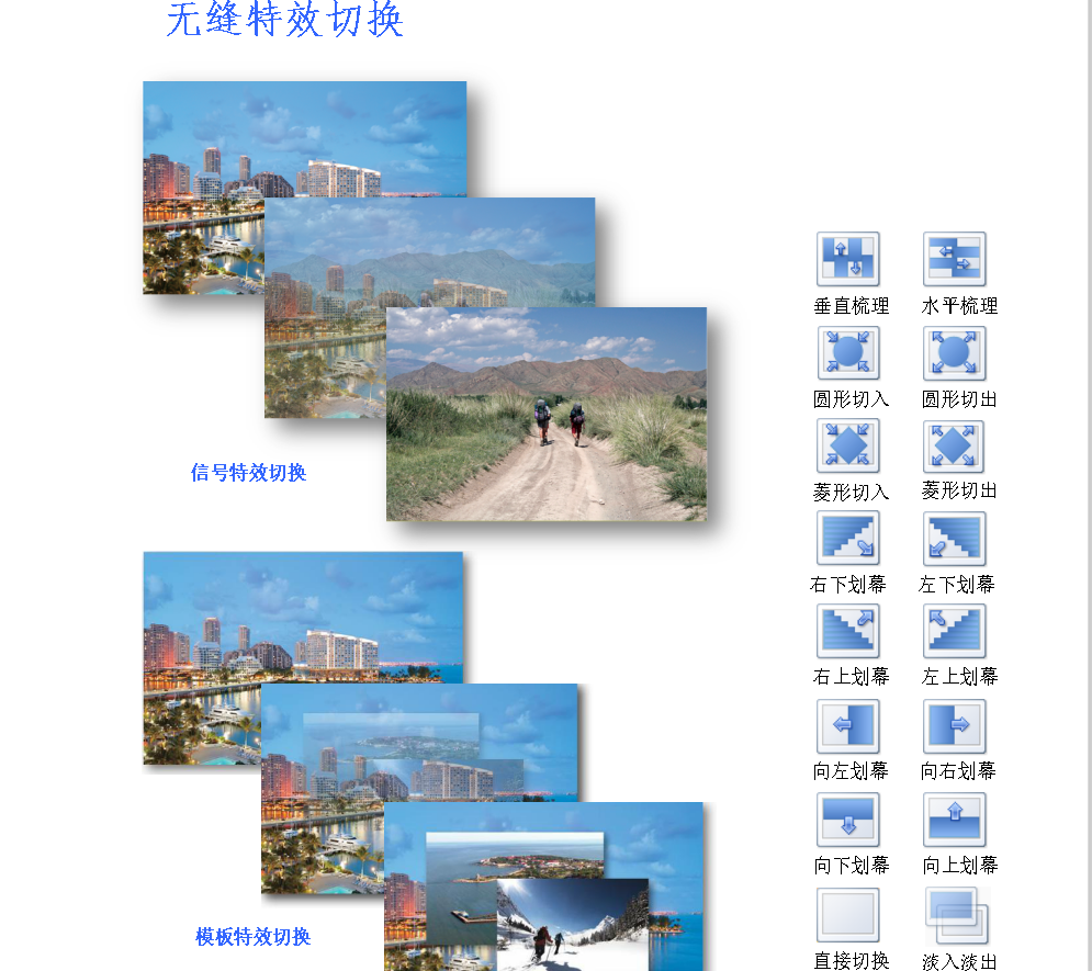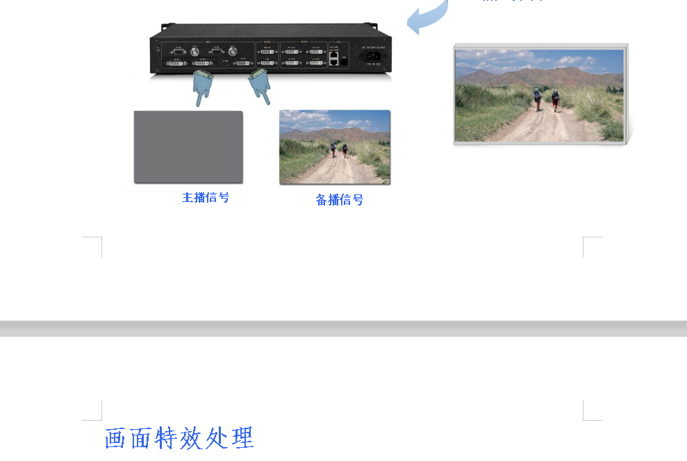 特效切換 | ·信號(hào)及模式切換時(shí),用戶可選擇不同的特效,包括:淡入淡出,無(wú)縫直切,垂直、水平梳理,圓形切入、切出,菱形切入、切出,各個(gè)方向的劃幕 |