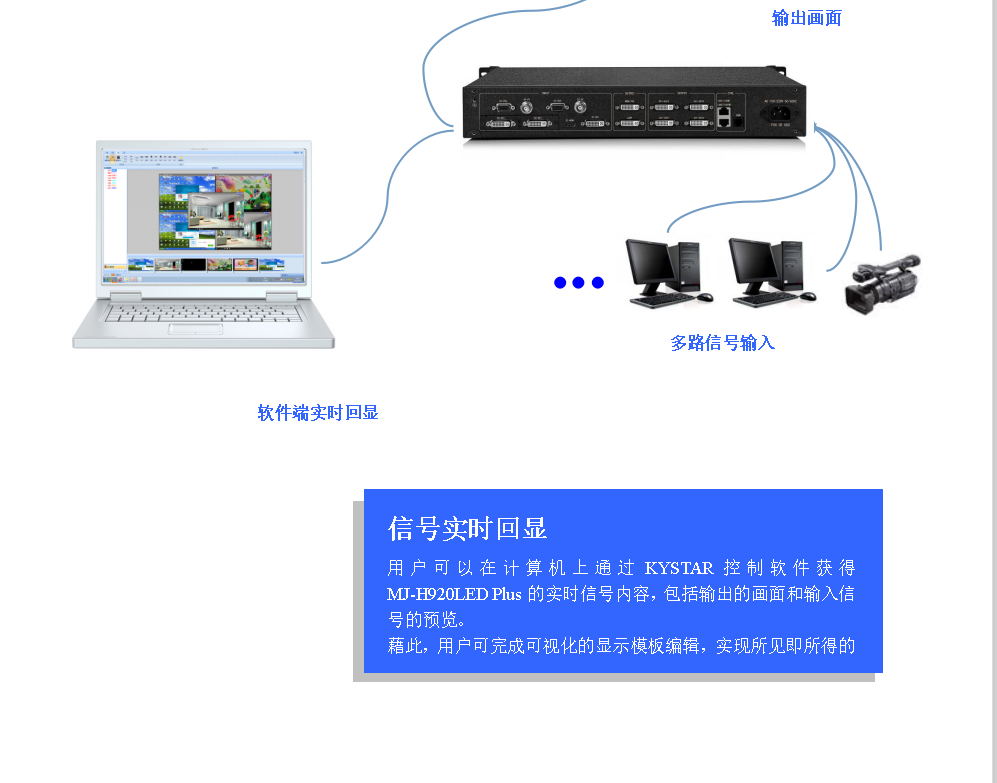 畫面回顯 | ·使用KYSTAR控制軟件可以在計(jì)算機(jī)上實(shí)時(shí)獲取MJ-H920LED Plus的信號(hào)畫面,包括輸入信號(hào)以及輸出信號(hào) |