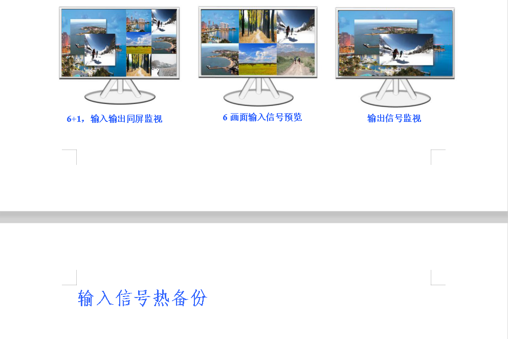 6+1畫面預(yù)覽和監(jiān)視 | ·用戶可以通過(guò)監(jiān)視器同時(shí)預(yù)覽6路輸入信號(hào),并可以同時(shí)監(jiān)視當(dāng)前的輸出畫面 |