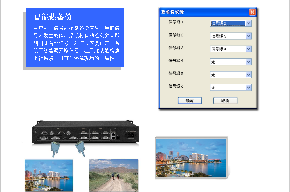 熱備份功能 | ·用戶可對(duì)輸入信號(hào)指定備份信號(hào),當(dāng)前信號(hào)故障時(shí),系統(tǒng)自動(dòng)輸出備份信號(hào),當(dāng)信號(hào)恢復(fù)時(shí)可自動(dòng)跳回 |