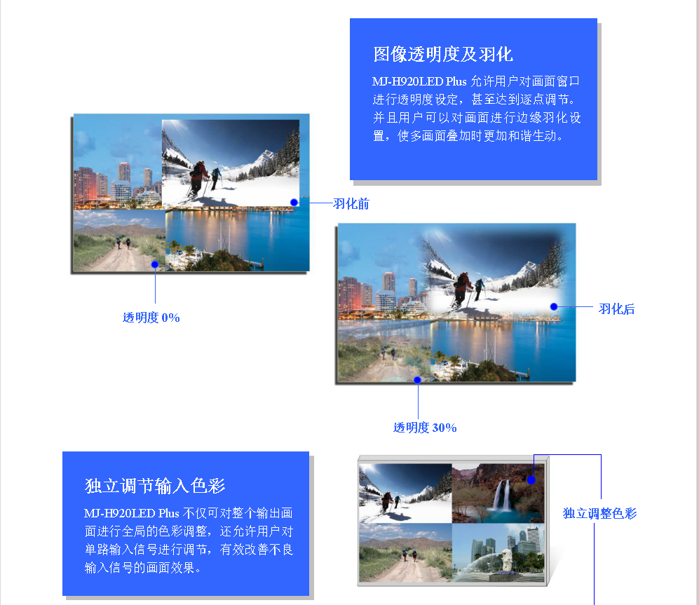 畫面透明度設(shè)置 | ·每個(gè)畫面的透明度可單獨(dú)調(diào)節(jié),0~100%可調(diào) |