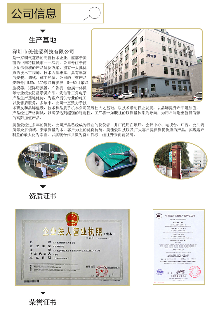 【深圳市美佳愛-液晶廣告機,觸摸一體機生產(chǎn)廠家電話400-997-9971】32寸紅外觸摸一體機(電腦/壁掛)產(chǎn)品通過ISO9001_3C認(rèn)證,主營多點紅外/電容式觸摸屏一體機,觸控查詢一體機,其他尺寸18.5寸21寸24寸27寸32寸40寸43寸46寸49寸55寸65寸75寸86寸98寸100寸多功能多媒體教學(xué)會議一體機,戶外立式/壁掛雙面廣告機,單機版/安卓網(wǎng)絡(luò)廣告機 豎屏樓宇電梯廣告機,長條型屏,工業(yè)級工控電腦觸摸顯示器,大尺寸觸摸屏查詢系統(tǒng),商顯平板電腦電視,提供報價價格,安裝施工,售后維修等