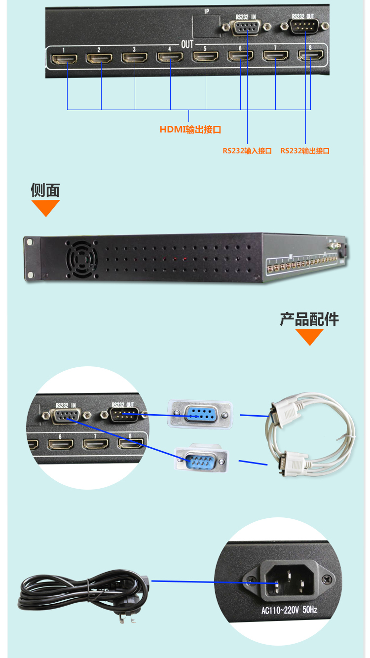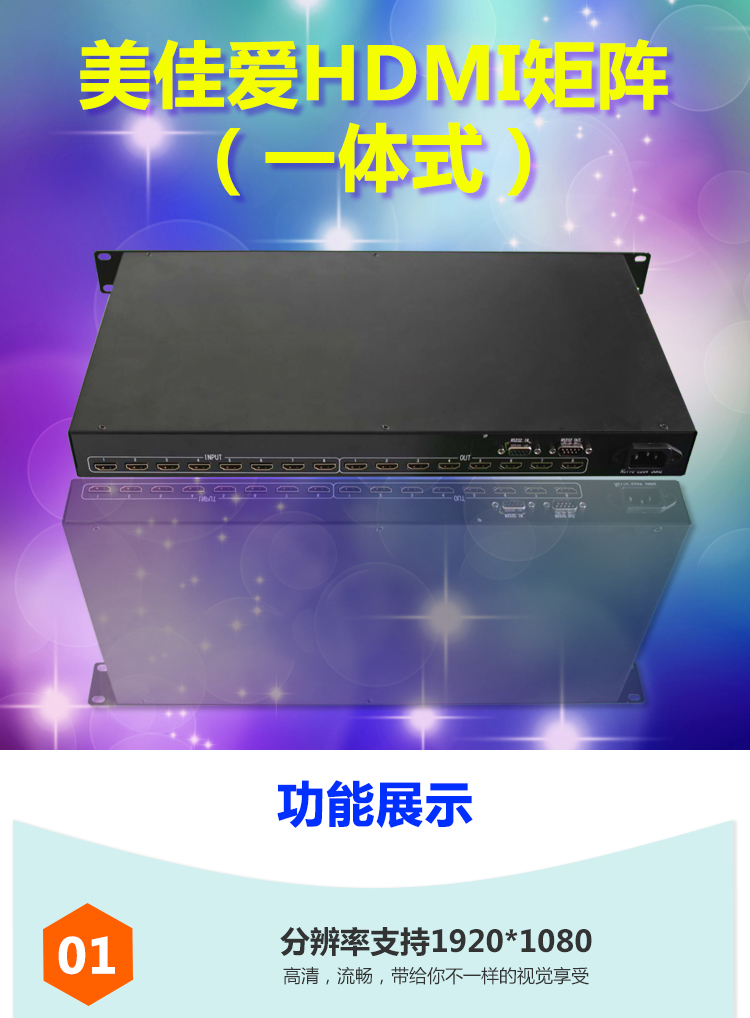 -HDMI高清全數(shù)字矩陣切換器, 所有端口支持藍光DVD(支持HDCP);輸入輸出自動均衡,輸入加輸出傳輸距離大于40米(不需配帶芯片的HDMI線);鋁拉絲面板,帶藍光液晶顯示屏顯示操作狀態(tài);帶串口控制,可選配網(wǎng)口;所有輸入端口支持現(xiàn)場寫EDID,所有輸出端口可讀回EDID。