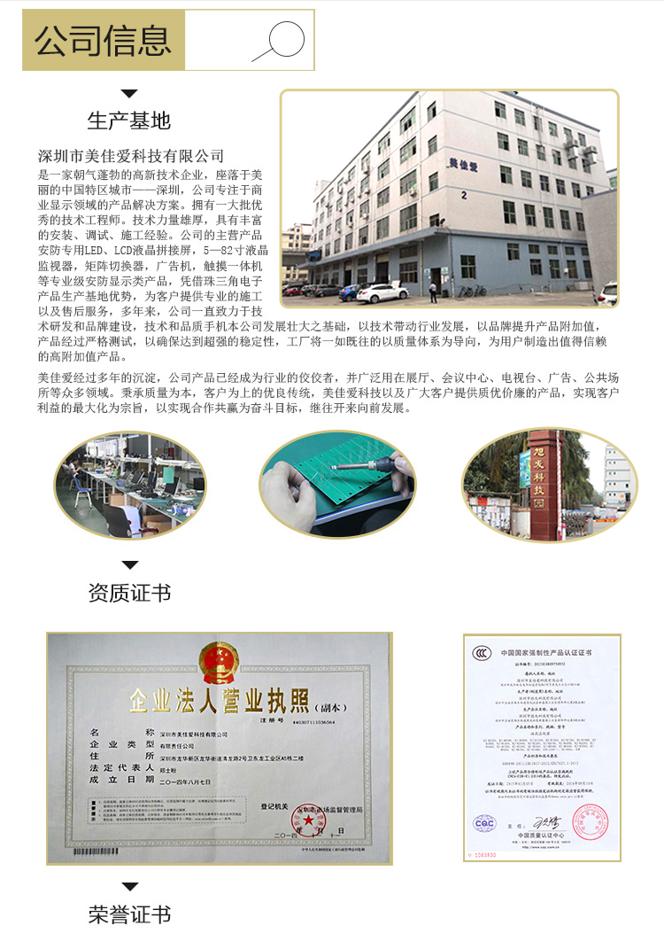 【深圳市美佳愛-液晶廣告機(jī),觸摸一體機(jī)生產(chǎn)廠家電話400-997-9971】紅外/電容壁掛觸摸屏電視電腦一體機(jī)產(chǎn)品通過ISO9001_3C認(rèn)證,主營多點(diǎn)紅外/電容式觸摸屏一體機(jī),觸控查詢一體機(jī),其他尺寸18.5寸21寸24寸27寸32寸40寸43寸46寸49寸55寸65寸75寸86寸98寸100寸多功能多媒體教學(xué)會(huì)議一體機(jī),戶外立式/壁掛雙面廣告機(jī),單機(jī)版/安卓網(wǎng)絡(luò)廣告機(jī) 豎屏樓宇電梯廣告機(jī),長條型屏,工業(yè)級工控電腦觸摸顯示器,大尺寸觸摸屏查詢系統(tǒng),商顯平板電腦電視,提供報(bào)價(jià)價(jià)格,安裝施工,售后維修等